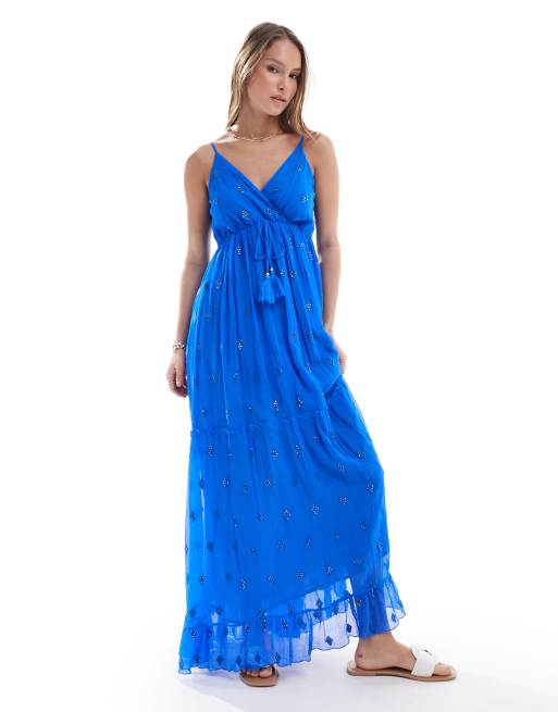 South Beach – Camisole-Maxikleid in Blau mit V-Ausschnitt und Paillettendetail