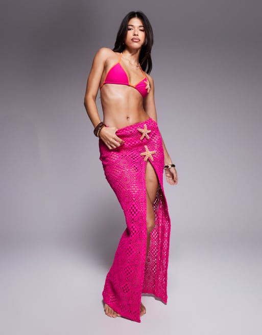South Beach – Gehäkelter Maxi-Strandrock in Magenta mit Seestern-Detail