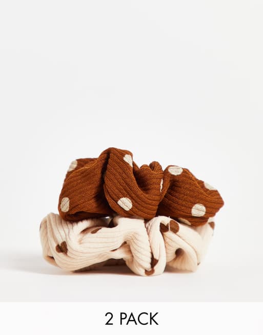 South Beach – Gepunktete Scrunchie-Haargummis in Braun und Cremeweiß im 2er-Pack
