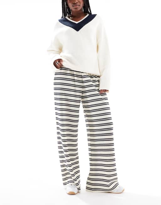 South Beach – Gestreifte Strickhose in Marineblau mit weitem Bein