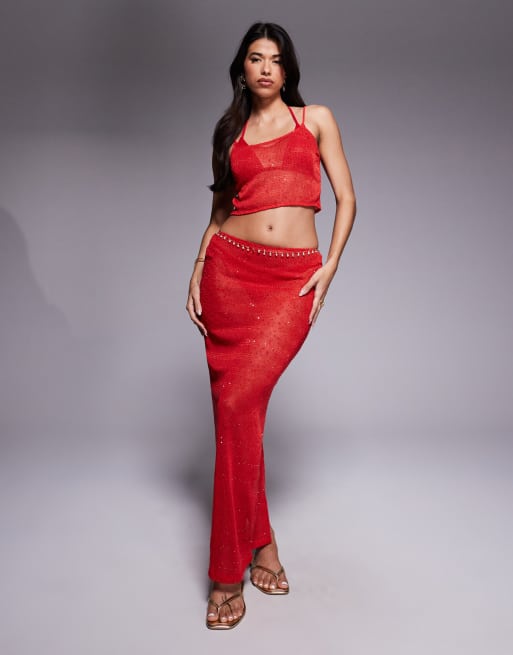 South Beach – Gestricktes Pailletten-Strand-Outfit in Rot