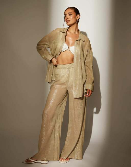South Beach – Strandhose mit weitem Bein in Metallic-Optik in Khaki