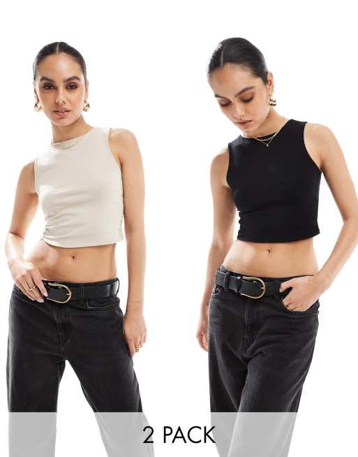 Stradivarius – 2er-Pack nahtlose Tanktops mit Raffung in Beige und Schwarz