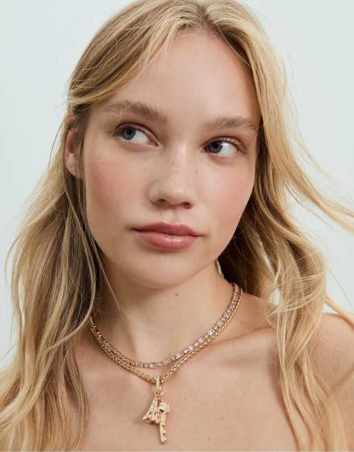 Stradivarius – 2er-Set goldfarbene Halsketten mit Strasssteinen und mehreren Anhängern