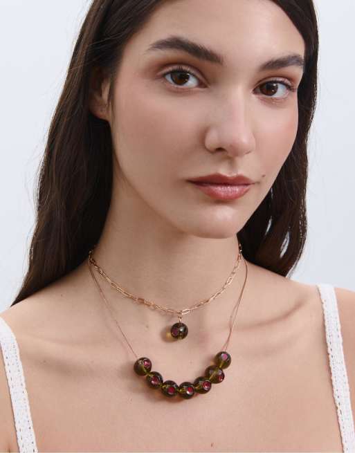 Stradivarius – 2er-Set Halsketten mit Oliven-Details in Olivgrün