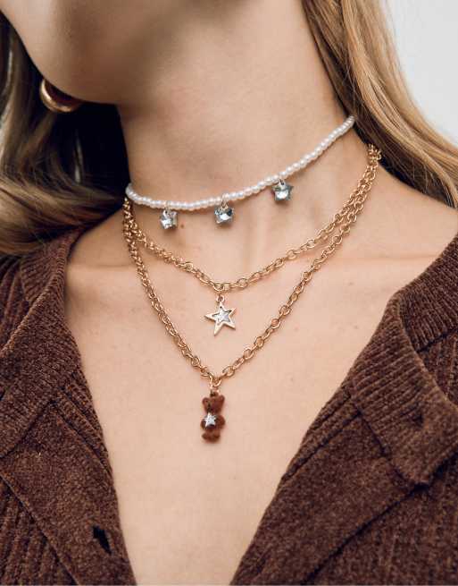 Stradivarius – 3er-Set Halsketten in Goldoptik mit Teddybär-Design