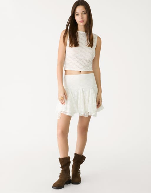 Stradivarius – Ärmelloses Oberteil aus Spitze in Weiß