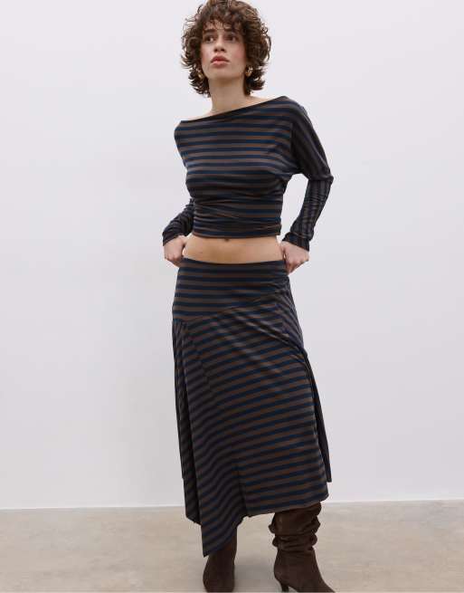Stradivarius – Asymmetrischer, gestreifter Maxirock in Marineblau