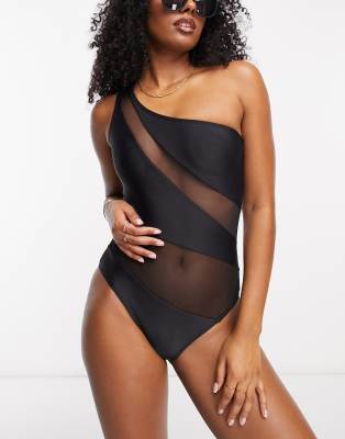 Stradivarius – Badeanzug mit One-Shoulder-Träger und Netzstoff-Einsätzen in Schwarz