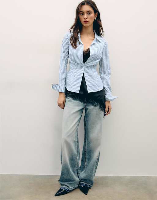 Stradivarius – Basic – Tailliertes Hemd in Schwarz gestreift