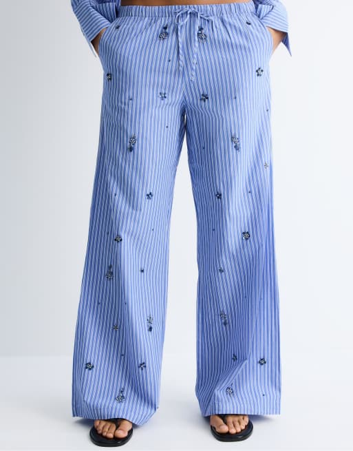Stradivarius – Bestickte Hose im Pyjama-Stil in Himmelblau