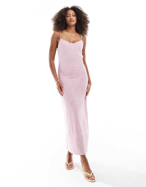 Stradivarius – Besticktes Midikleid in Blassrosa