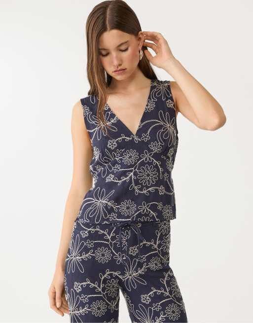 Stradivarius – Besticktes Oberteil aus Leinenmix in Marineblau