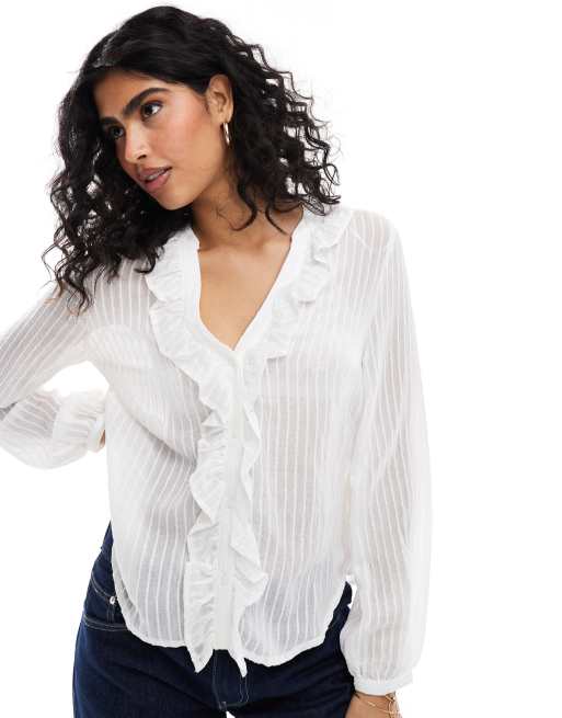 Stradivarius – Bluse in Weiß mit Rüschendetail