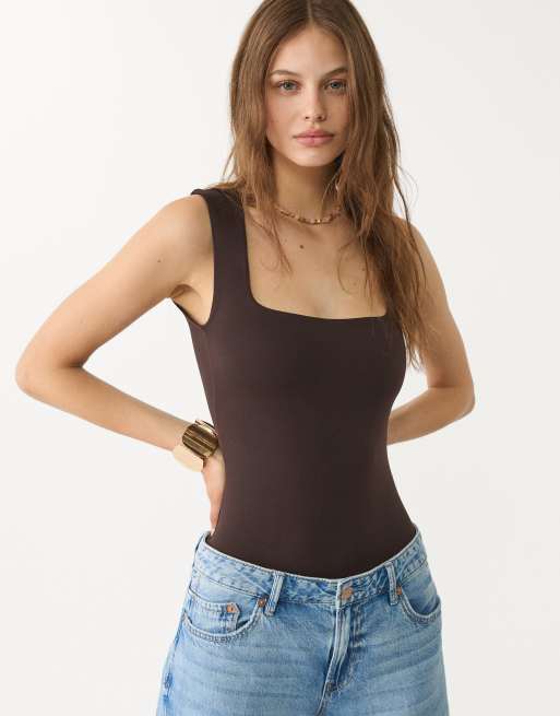 Stradivarius – Body in Braun aus Polyamid mit eckigem Ausschnitt