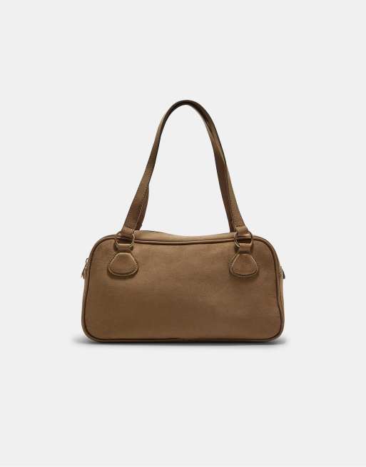 Stradivarius – Bowlingtasche aus Wildlederimitat in Karamell mit Ringen