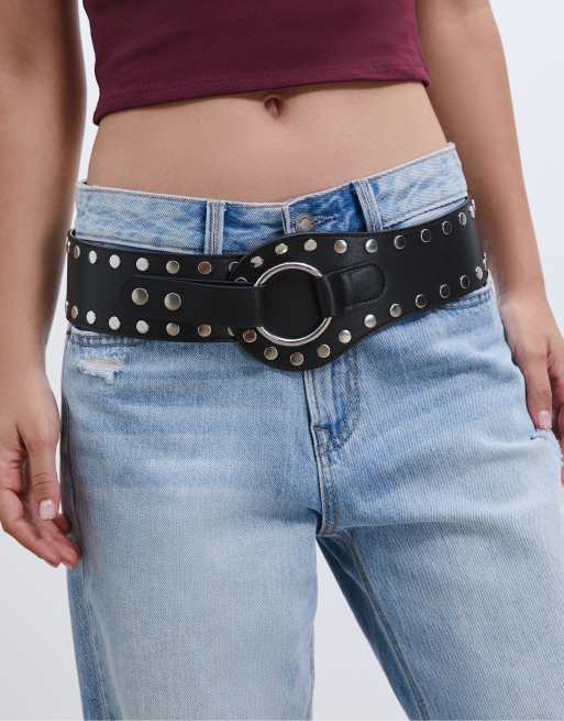 Stradivarius – Breiter Gürtel in Schwarz mit Nietenverzierung