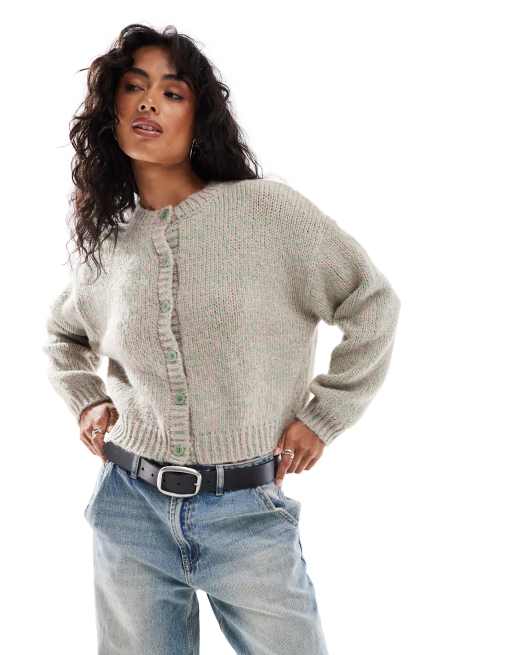 Stradivarius – Bunte, dicke Strickjacke in Rosa und Grün