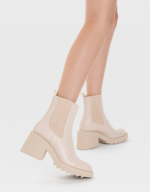 Stradivarius – Chelsea-Stiefel in Ecru mit dicker Sohle und Absatz