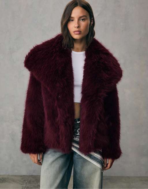 Stradivarius – Cropped Jacke aus Kunstpelz in Burgunderrot
