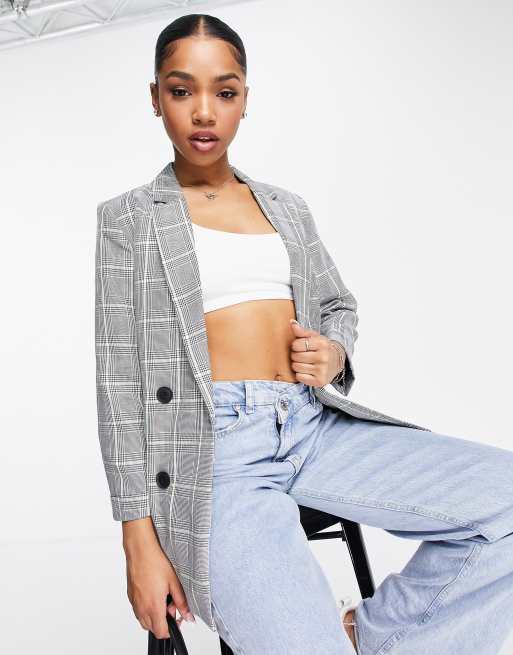 Stradivarius – Doppelreihiger Blazer in grau kariert