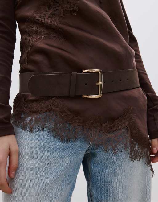 Stradivarius – Etwas breiterer Gürtel aus Wildlederimitat in Goldoptik