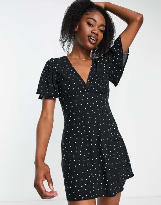 Stradivarius – Freizeitkleid mit V-Ausschnitt in Schwarz mit weißem Punktmuster