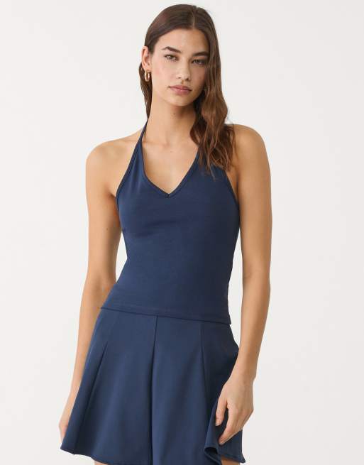 Stradivarius – Gebundenes Neckholder-Oberteil in Marineblau