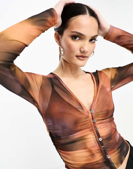 Stradivarius – Geraffte Netzstoff-Hemdbluse mit verschwommenem Muster in Orange