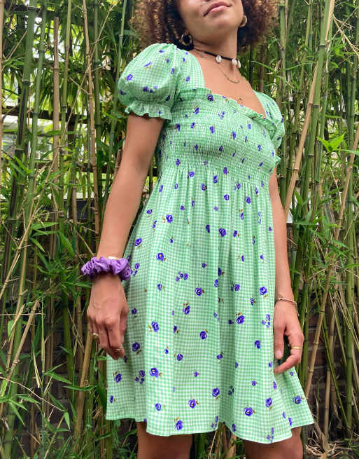 Stradivarius – Gerafftes Minikleid mit grünem Karomuster und eckigem Ausschnitt