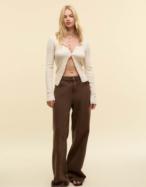 Stradivarius – Gerippte Strickjacke in Steinbeige mit Knöpfen