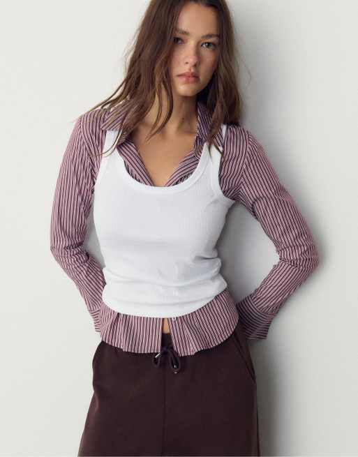 Stradivarius – Geripptes T-Shirt in Weiß mit Ringerrücken