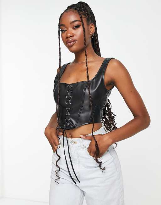 Stradivarius – Geschnürtes Korsett-Oberteil aus Kunstleder in Schwarz
