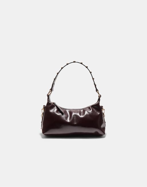 Stradivarius – Halbmondförmige Schultertasche in Braun mit Nietenbesatz