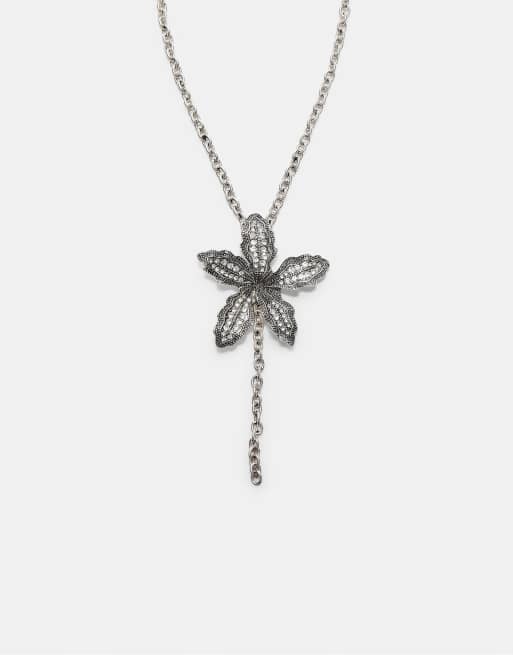 Stradivarius – Halskette in Grau mit strassbesetztem Blumenanhänger