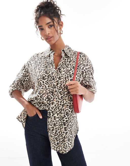 Stradivarius – Hemdbluse in Leinenoptik mit Leopardenmuster