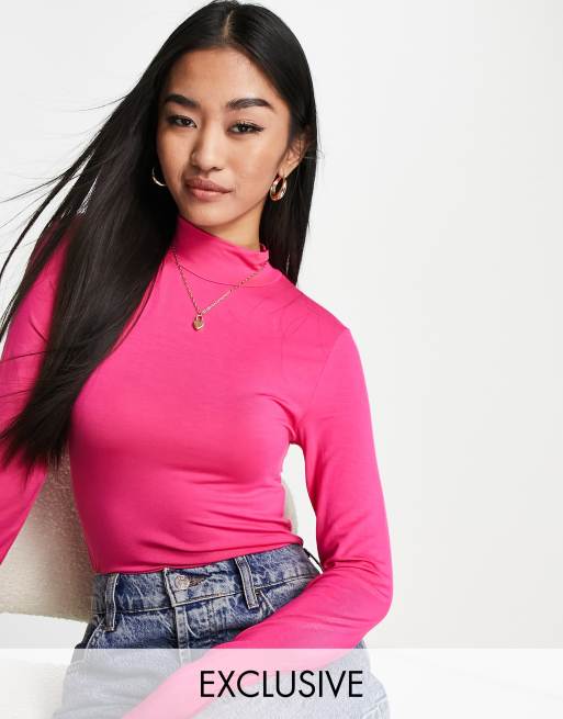 Stradivarius – Hochgeschlossenes, langärmliges Oberteil in leuchtendem Rosa