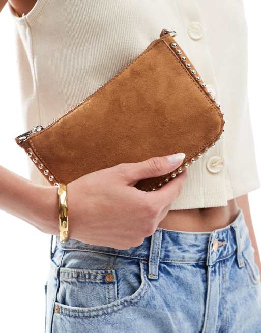 Stradivarius – Kleine Tasche aus Wildlederimitat in blassem Kamelbraun mit Perlen