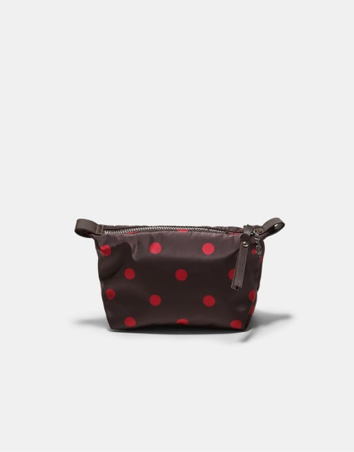 Stradivarius – Kulturbeutel in Braun mit Polka Dots