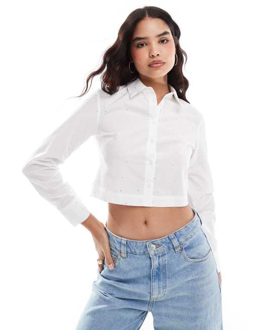 Stradivarius – Kurze Hemdbluse in Weiß mit Strassverzierung
