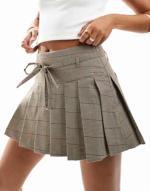 Stradivarius – Kurzer, karierter Falten-Skort in Braun mit Bindegürtel