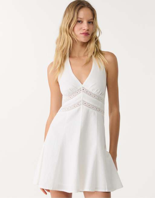 Stradivarius – Kurzes Neckholder-Kleid aus Leinenmix in Ecru