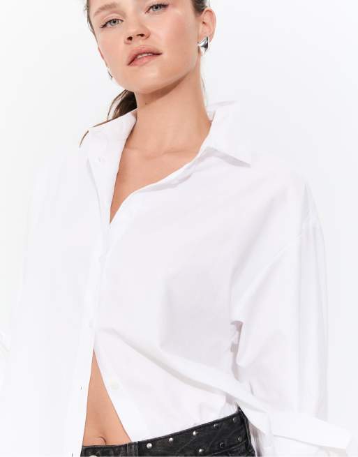 Stradivarius – Lange Hemdbluse aus Popeline in Weiß