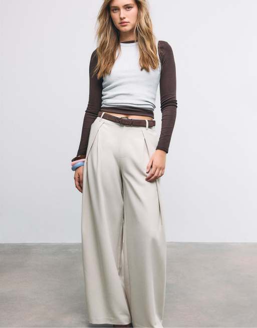 Stradivarius – Lange Hose in Eisweiß mit Abnähern und Gürtel