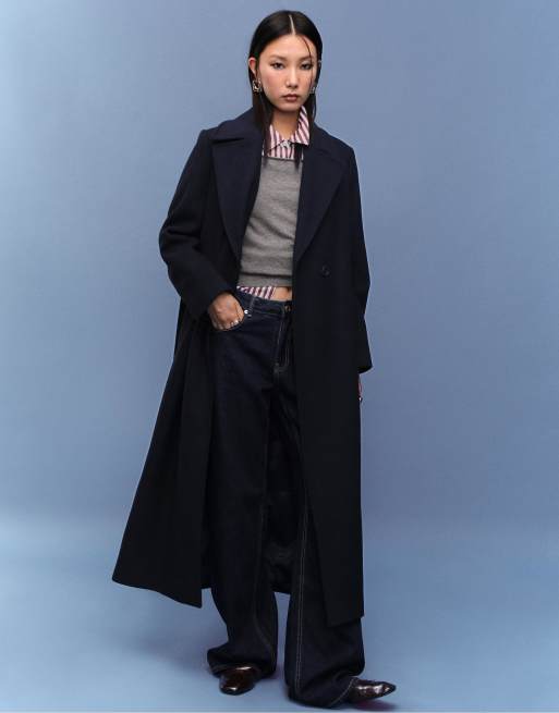 Stradivarius – Langer Mantel in Dunkelblau mit Bindegürtel