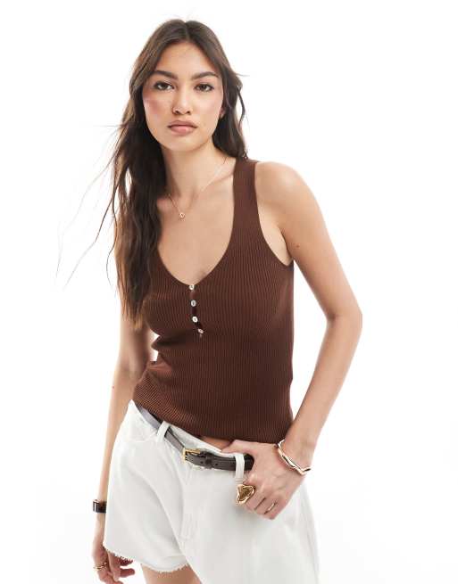 Stradivarius – Leichtes Strick-Trägertop in Braun mit Knopfleiste