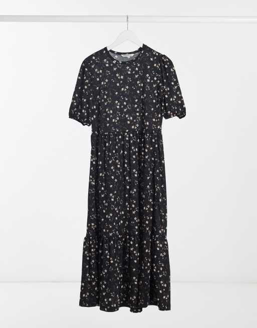 Stradivarius – Midi-Hängerkleid mit Rüschen in Schwarz geblümt