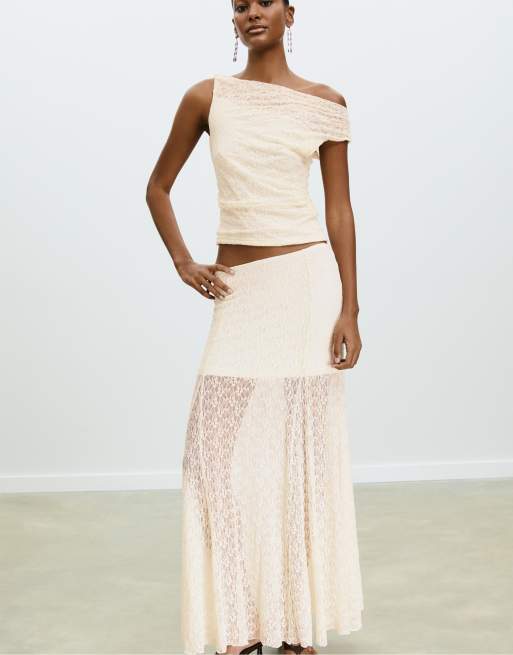 Stradivarius – Midirock aus Spitze in Ecru