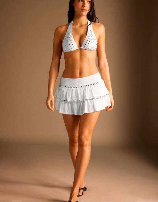 Stradivarius – Minirock in Ecru mit Rüschen und Nieten