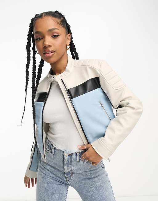 Stradivarius – Moto Miami – Jacke aus Kunstleder in Weiß & Blau